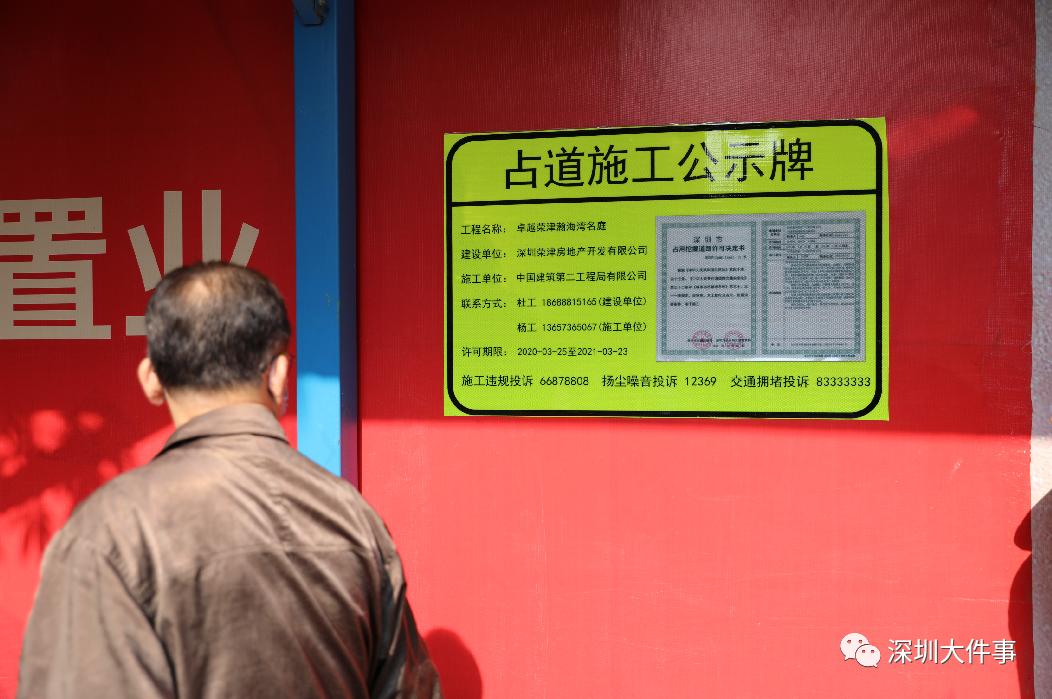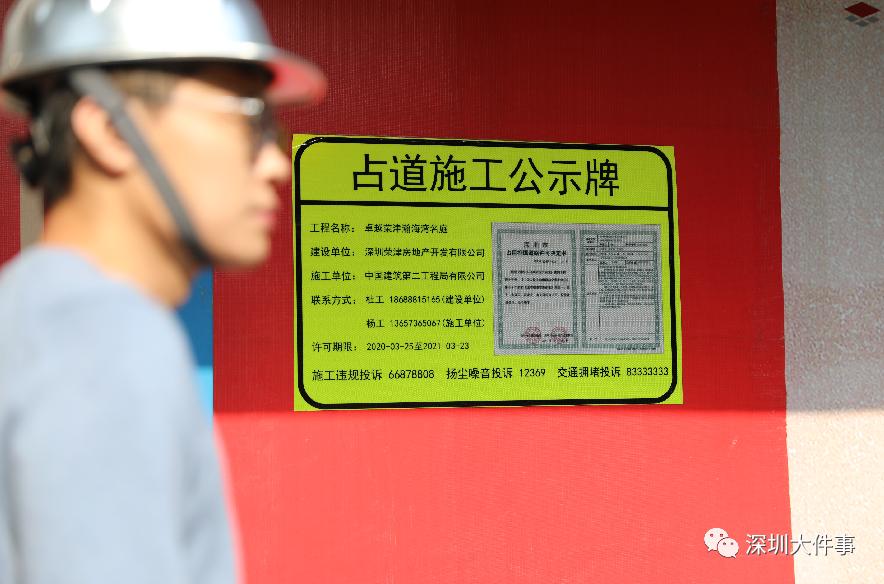 3月9日,我們在鹽田區(qū)卓越榮津瀚海灣名庭施工現(xiàn)場看到,圍欄外每隔50米就張貼了最新版的占道施工公示牌,且在便于行人查閱的顯眼位置。