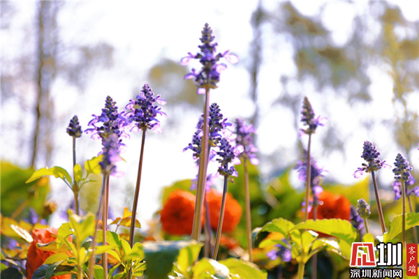 繁花似錦,花香滿園,而紫色的大花飛燕草在陽光下最為亮眼。