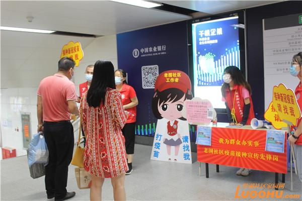 客運繁忙的大劇院地鐵站就在老圍社區(qū),老圍社區(qū)黨委就把“疫苗接種宣傳先鋒崗”從小區(qū)卡口擴(kuò)展到地鐵口。在川流不息的地鐵口,宣傳崗上的大字“我為群眾辦實事,老圍社區(qū)疫苗接種宣傳先鋒崗”,金光閃閃格外醒目。旁邊的小喇叭循環(huán)播放:“接種疫苗人人有責(zé),打第二針疫苗請找我,不用排隊不用預(yù)約,專車接送。”