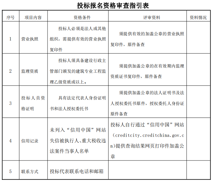 3.2報(bào)名時(shí)請(qǐng)攜帶投標(biāo)人必須具備的資格條件中要求的所有資格證明材料(請(qǐng)?zhí)顚懜郊?《投標(biāo)報(bào)名資格審查指引表》并按指引表將材料排序,所有材料須提供復(fù)印件并加蓋公章,原件備查),授權(quán)委托證明書(shū)原件、U盤及100元報(bào)名費(fèi)(無(wú)論中標(biāo)與否,報(bào)名費(fèi)一律不退)。