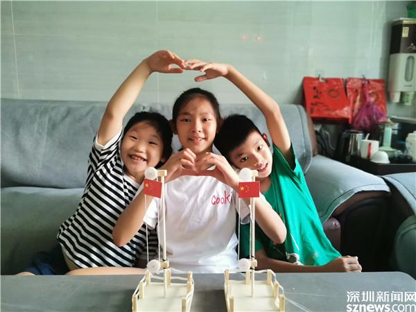 當(dāng)天下午,20位回答了問(wèn)題的小朋友得到了獎(jiǎng)品,一個(gè)大大的工具包。他們要將工具包帶回家,自己動(dòng)手,拼裝一個(gè)五星紅旗升降臺(tái)。吳燕柔姐弟三人第一個(gè)完成,他們一起在家中舉行升旗儀式。姐姐慢慢搖動(dòng)升降臺(tái)的把手,三雙大眼睛盯著冉冉升起的五星紅旗,齊聲唱響了國(guó)歌。姐姐升完了弟弟再升,三人輪流一番,國(guó)歌也就一遍遍響起。意猶未盡之際,姐弟三人還比了一個(gè)大大的心,與自己親手制作的五星紅旗升降臺(tái)合影。