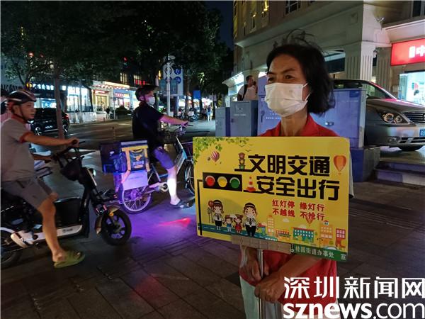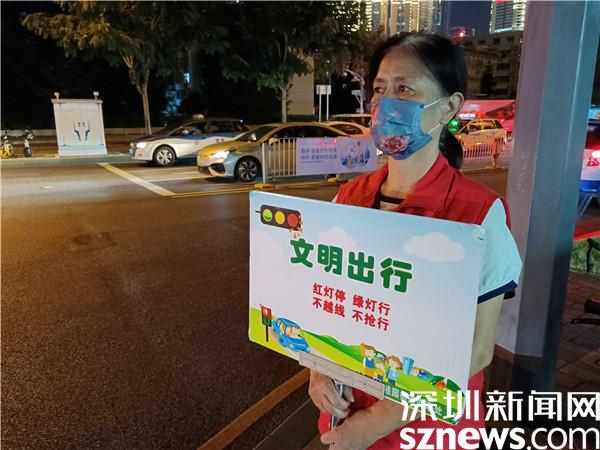另一位堅守在國慶假期里的義工是宣仲英,今年62歲。她一站兩個小時,始終是精神抖擻,毫不松懈。看到有人試圖闖紅燈,她及時制止??吹接腥瞬蛔甙唏R線,她立刻提醒。她手持勸導(dǎo)文明出行的牌子,就像個交通警察,誰也別想在她的面前犯規(guī)。本來下午6點(diǎn)鐘,正是她給家人做晚餐,同家人一起吃飯的時間,但她聽說社區(qū)創(chuàng)文需要人,就跟家人商量,得到了家人的一致同意。她說,“我從內(nèi)地來到深圳,在老圍社區(qū)住了10年,感覺深圳做義工的氛圍特別濃厚,我也想做義工,為社會發(fā)揮余熱?!?/span>