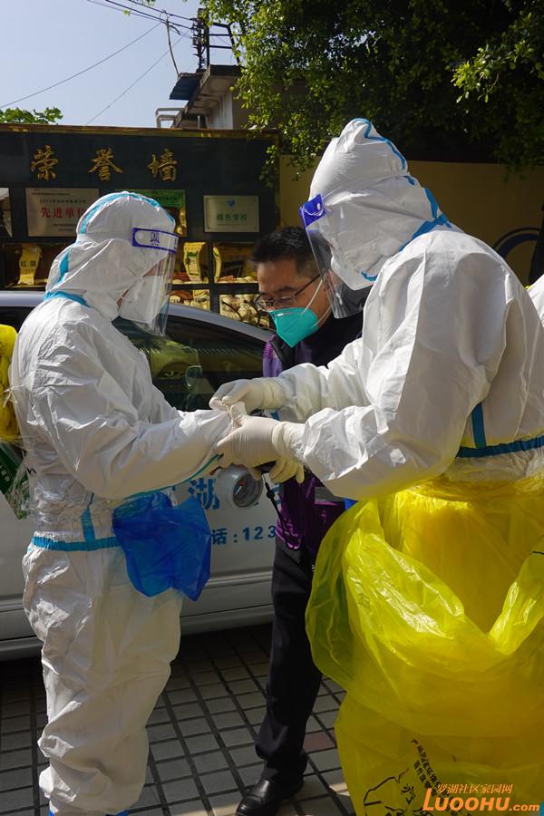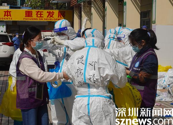 臘八節(jié)剛過,深圳帶著些許涼意,卻也是艷陽高照?!巴緜?,相互檢查一下手腕腳腕有沒有貼好!穿戴整齊后準備集結(jié)出發(fā)啦!”在封控區(qū)外圍的醫(yī)護人員整備區(qū),一群身穿防護服、全副“武”裝的工作人員整裝待發(fā),兩人一組,目光堅定,向著封控區(qū)的入口走去。