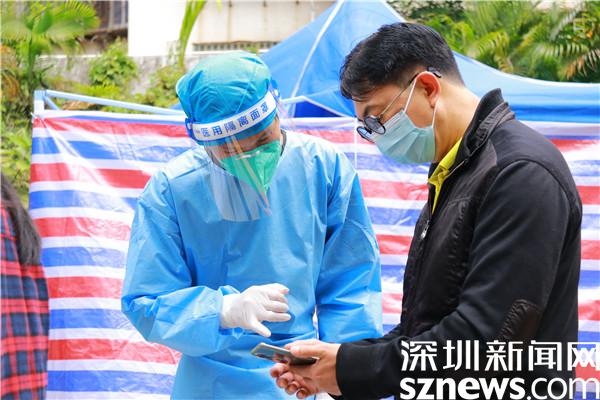 從2月17日開始,劉曉勇加入安保公司,被派到羅湖區(qū)東曉街道支援疫情防控工作,至今已有13天,13天里,他跟隨隊伍轉遍了東曉街道各個核酸檢測點,從分流人群、維持秩序,到掃碼、引導居民操作、核酸檢測點布置、采樣結束收尾……對每個流程都了如指掌;13天里,他每天工作十幾個小時,從早上九點到晚上十點、十一點,只在中午輪班吃飯的時候有十幾分鐘休息時間。