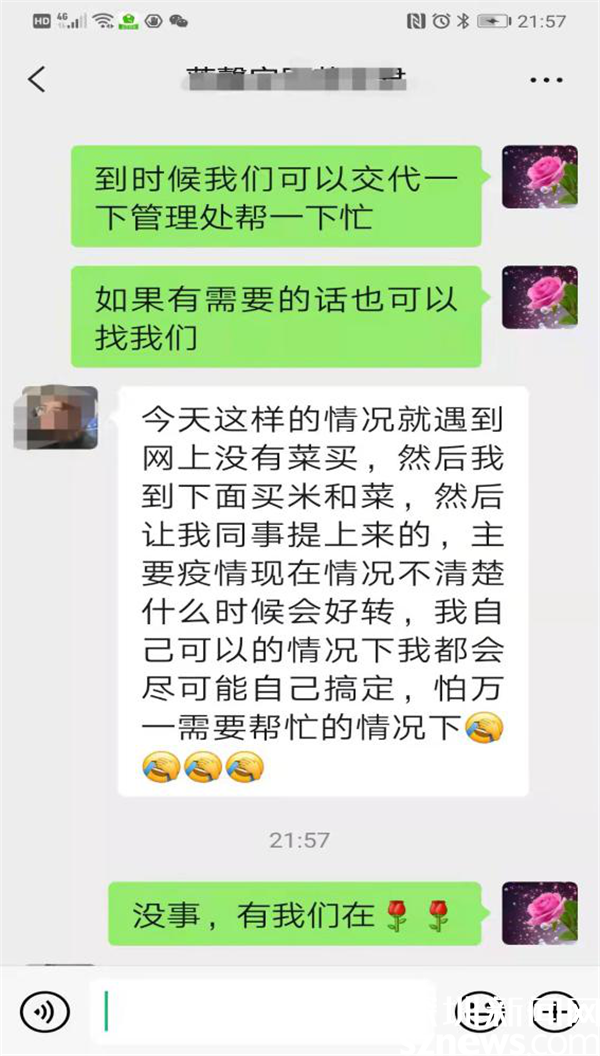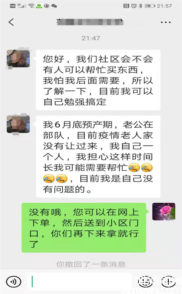 3月13日晚近十點(diǎn),家住蓮塘街道蓮馨家園的黃女士通過(guò)微信向畔山社區(qū)黨委副書(shū)記鄒紅梅求助,詢(xún)問(wèn)社區(qū)能否在自己待產(chǎn)不方便的情況下幫助購(gòu)物送貨……。原來(lái),黃女士預(yù)產(chǎn)期在6月份,丈夫在部隊(duì)服役,因?yàn)橐咔樵?,家中老人無(wú)法過(guò)來(lái)深圳照顧,只能自己在家休養(yǎng),心理壓力較大顧慮較多。了解到情況后,鄒紅梅耐心疏導(dǎo)黃女士焦慮和恐慌情緒,說(shuō)明社區(qū)的關(guān)愛(ài)措施,并微信回復(fù)說(shuō),“需要幫忙,可以找我們。放心吧,有我們?cè)?。?/p>