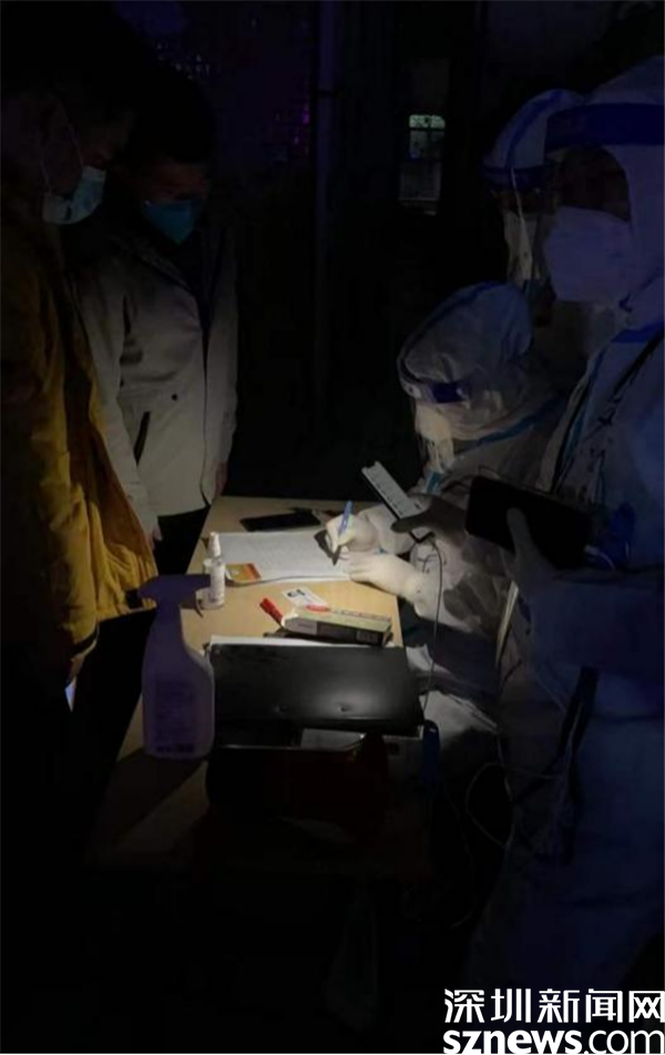 ▲臨時(shí)工作場(chǎng)所尚未配備照明設(shè)備,下沉干部打著手機(jī)閃光燈登記居民采樣信息