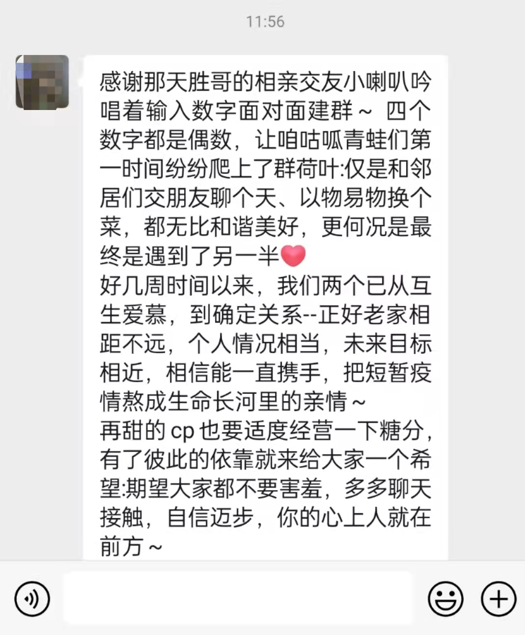 一開始單身交友群只有一個,慢慢地周邊社區(qū)越來越多人加入,群聊數(shù)量增加到了十個。由于群信息互不相通,王勝在每天做完工作后,轉(zhuǎn)發(fā)各單身青年的個人介紹、照片以及擇偶標準到十個群里,有時發(fā)成語接龍的小游戲活躍氣氛?!叭豪锏膯紊砬嗄陚兎浅7e極,大家都喜歡這種模式。我沒事的時候也經(jīng)常和他們聊聊天,讓大家隔離期間?!蓖鮿僬f。