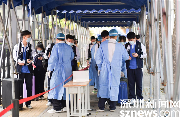 當天早上,在羅湖高級中學校門口,學校老師、校醫(yī)、義工家長等早早來到校門口,迎接同學們的到來,每個同學都自覺戴好口罩,間隔一米距離,背著書包,拖著行李箱,進入學校前出示???、粵康碼綠碼、行程卡以及24小時核酸陰性證明,并進行衣物、行李、鞋底和手部消毒等。在經(jīng)歷了長達一個多月的線上課程后,同學們終于返回闊別已久的校園。突然開學是怎樣的心情?讓我們一起跟隨鏡頭直擊現(xiàn)場。