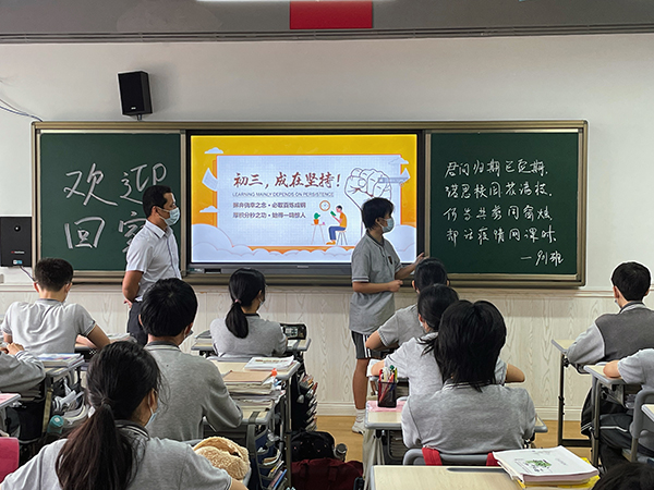 教室里,“歡迎回家”的字眼撥動(dòng)學(xué)生們返校的心弦。班主任自創(chuàng)的一首無題小詩,將學(xué)生們的線上時(shí)光與線下相見相串聯(lián),潛移默化中過渡著焦慮,拉近著距離,蘊(yùn)藏著無限激勵(lì)!