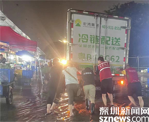 在蘭花社區(qū)豐湖大廈果蔬集散市場,有三輛農(nóng)產(chǎn)品運輸車拋錨,在接到求助信息后,蘭花社區(qū)黨委副書記鄒添文和其它值班同事立即趕往現(xiàn)場,冒雨將車輛推離市場?!皬?月11日上午9點,到5月12日上午9點,我一直在崗。我們對社區(qū)進行了全面排查,確保暴雨期間居民的生命和財產(chǎn)安全?!编u添文在接受記者采訪時表示,“凌晨三點,我們還在市場處理拋錨車輛,那時候也是雨勢最為迅猛的時候,雖然大家都變成了落湯雞,身上又冷又膩特別難受,但是看到車輛成功駛離,還是很有成就感的。”