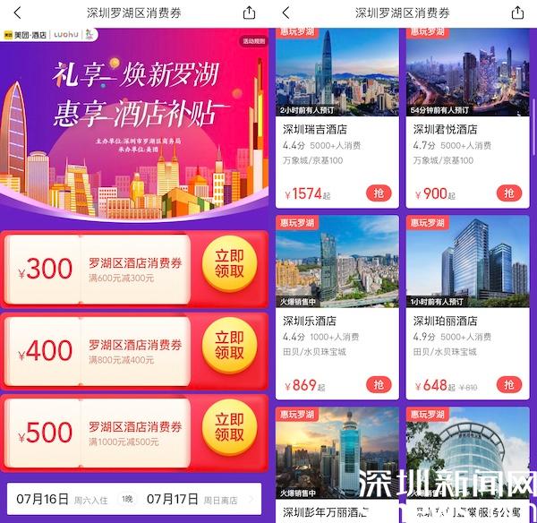 讀特客戶端·深圳新聞網(wǎng)2022年7月16日訊(記者 覃鈺清)7月16日,羅湖區(qū)會同羅湖區(qū)酒店行業(yè)協(xié)會、美團(tuán)推出“禮享煥新羅湖,惠享酒店補(bǔ)貼”活動,投入33萬扶持資金,用于支持酒店、住宿消費(fèi)。消費(fèi)者可在美團(tuán)APP搜索“羅湖消費(fèi)券”、“羅湖酒店消費(fèi)券”等關(guān)鍵詞進(jìn)入活動頁面,點擊“領(lǐng)取”按鈕即可獲得。本次優(yōu)惠額度包括:滿1000元減500元、滿800元減400元、滿600元減300元,最高五折優(yōu)惠,可在羅湖轄區(qū)內(nèi)40余家酒店使用。