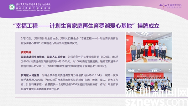 今年初,深圳市計劃生育協(xié)會、人口基金會就創(chuàng)建了一項“幸福工程”,旨在為計劃生育家庭再生育提供幫助。今年5月30日,第一個幸福工程基地就選擇坐落于羅湖醫(yī)院,項目為符合條件的夫妻提供總額高達16500元的醫(yī)療補貼,同時,羅湖醫(yī)院還給予相應的醫(yī)療減免,包括手術(shù)及藥品費用的配套補貼。為居民再生育提供了很好的幫助,大大降低了經(jīng)濟壓力,讓更多的家庭愿意再生育。