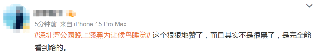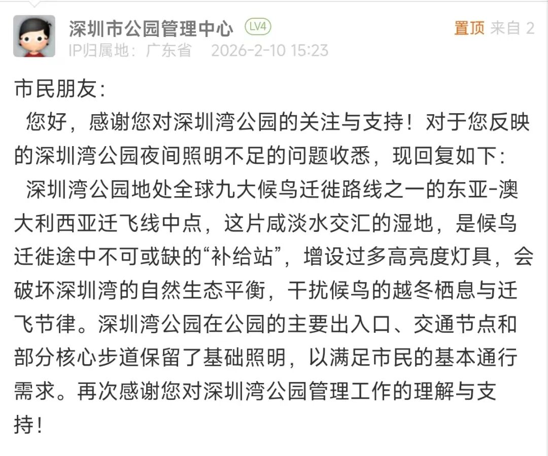 該網(wǎng)友表示,自己陪外地來的親戚逛深圳灣公園時,被問住了。“晚上公園怎么黑漆漆的?這么好的公園,沿著海邊吹吹風(fēng),又能騎車又能散步,但一路都沒什么燈。為什么不裝幾盞亮一點的燈,讓夜晚更亮堂一些呢?”