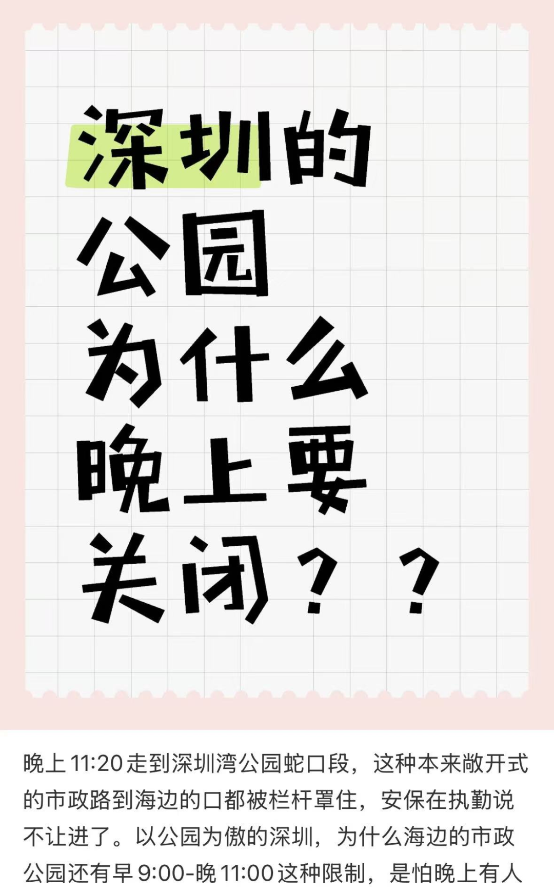 “深圳很多海濱公園晚上閉園太早,能否將封閉管理的公園等城市空間打開?”此前,有網(wǎng)友在網(wǎng)絡(luò)上發(fā)文,希望將海濱公園開放時間調(diào)整為24小時開放。