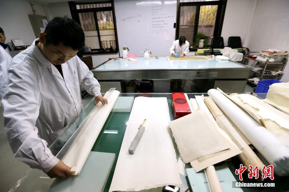 “文物醫(yī)生”在“書畫文物修復(fù)室”內(nèi)工作。中新社記者 張遠 攝