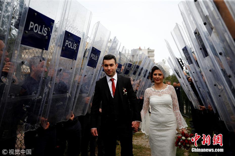當(dāng)?shù)貢r(shí)間2018年3月21日,土耳其安塔利亞,警官Ceren Ekici和Taha YasinGul舉行婚禮。在10個(gè)月前的一次行動(dòng)中,Taha YasinGul不慎開槍擊中Ceren Ekici的頭部,所幸沒有造成生命危險(xiǎn)。他們的婚禮由警局同事操辦,同事們舉著防彈盾牌,護(hù)送這對新人走向禮臺。圖片來源:視覺中國