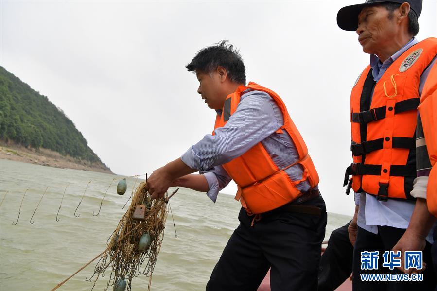 在鄱陽湖湖口段,江豚協(xié)助巡護(hù)隊(duì)隊(duì)員在湖面上清繳排鉤等違規(guī)作業(yè)工具(5月5日攝)。新華社記者 彭昭之 攝