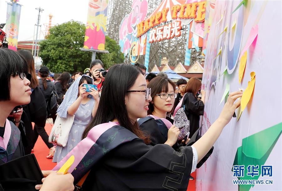 6月10日,畢業(yè)生們將寫(xiě)著自己畢業(yè)愿望的貼紙貼到留言墻上?!⌒氯A社記者 方喆攝