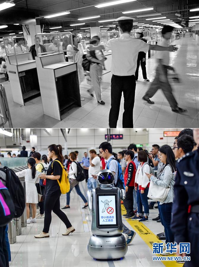 拼版照片:上圖為旅客經(jīng)過深圳羅湖口岸(資料照片,新華社記者陳小波攝);下圖為2018年4月6日,在深圳灣口岸出境大廳,機(jī)器人在自助查驗通道前對旅客進(jìn)行提示(新華社記者毛思倩攝)。新華社發(fā)