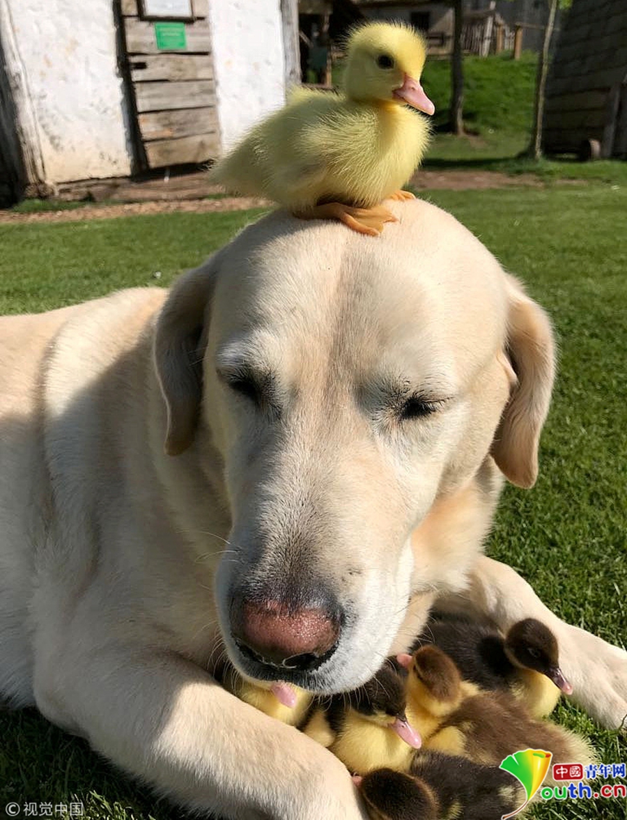 2018年5月22日訊(具體拍攝時(shí)間不詳),英國艾塞克斯郡芒特菲奇特城堡,一只名為弗雷德的拉布拉多和它“收養(yǎng)” 的9只小鴨子。小鴨子的媽媽突然失蹤,10歲的弗雷德就成了它們的“新爸爸”。圖片作者/視覺中國