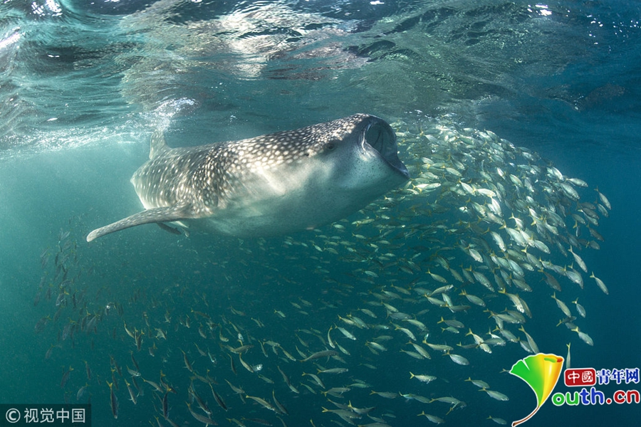 2018年3月30日訊(具體拍攝時(shí)間不詳),非洲,一只鯨鯊張開大嘴試圖吞下似龍卷風(fēng)盤旋著的浮游生物群。