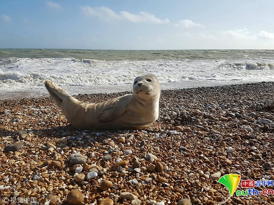 英國(guó)肯特郡鄧杰內(nèi)斯,46歲的達(dá)倫·伍德帶著鄰居家的孩子們釣魚(yú),這只可愛(ài)的海豹爬出海面跟他們“打招呼”。