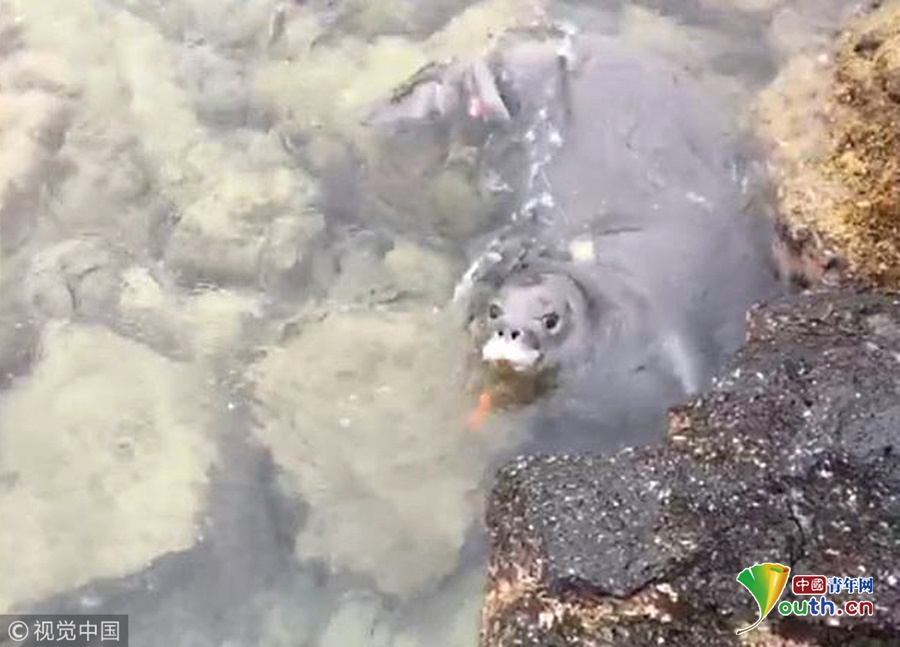 自然資源部的發(fā)言人稱它在近岸的巖石下發(fā)現(xiàn)了這個橙色小刀。一位工作人員說他很擔(dān)心小海豹會吞下刀,他還提醒我們要妥善處理垃圾,不要隨意丟棄在海灘上或者海里。