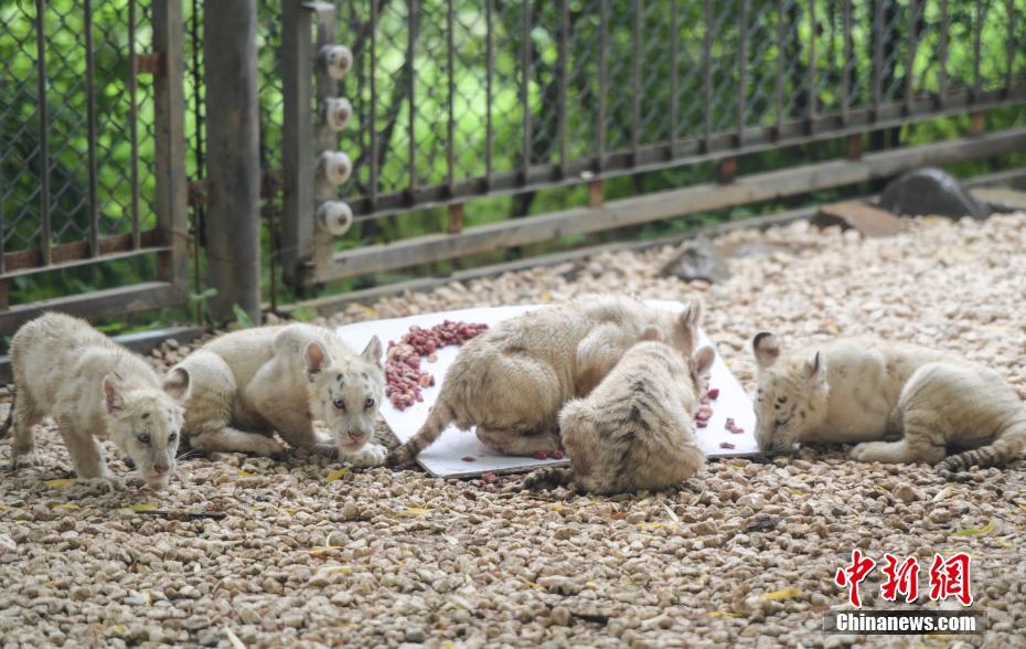 7月10日,雪虎五胞胎分享“肉餡蛋糕”。當(dāng)日,濟(jì)南野生動物世界五胞胎雪虎誕生滿百日,正式與游客見面。中新社記者 張勇攝