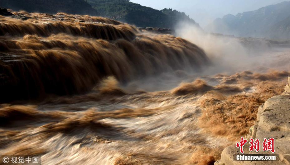 7月17日,山西臨汾,游客在黃河壺口瀑布游覽觀瀑。進(jìn)入7月主汛期,受黃河上游降雨量增多影響,位于山西吉縣和陜西宜川縣交界的黃河壺口瀑布水量暴漲。濁浪滔天的壯美瀑布群景觀,吸引了眾多游客。呂桂明攝 圖片來(lái)源:視覺(jué)中國(guó)