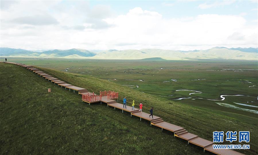 游客在瑪曲縣阿萬(wàn)倉(cāng)濕地的觀景步道上游覽(7月31日無(wú)人機(jī)拍攝)。 新華社記者 陳斌 攝