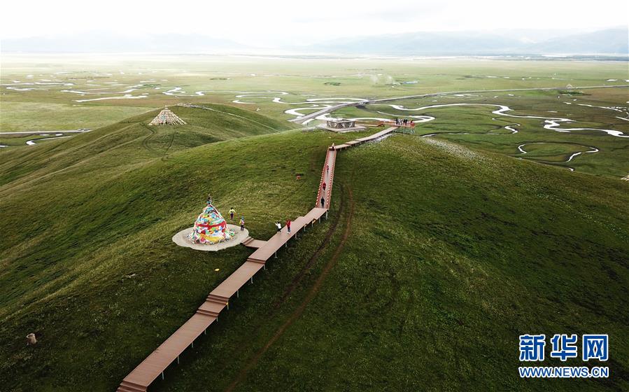 游客在瑪曲縣阿萬倉濕地的觀景步道上游覽(7月31日無人機(jī)拍攝)。新華社記者 陳斌 攝