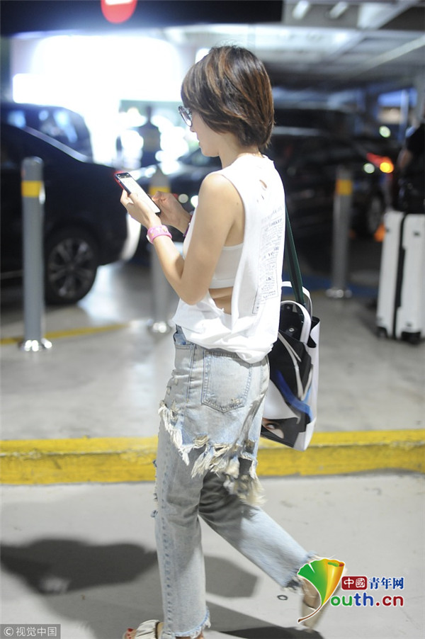 2018年8月20日,上海,馬伊琍現(xiàn)身機(jī)場,她身穿清爽白T,小蠻腰隱現(xiàn),搭配“乞丐風(fēng)”破洞褲扮潮,一路低頭走狂刷手機(jī)。