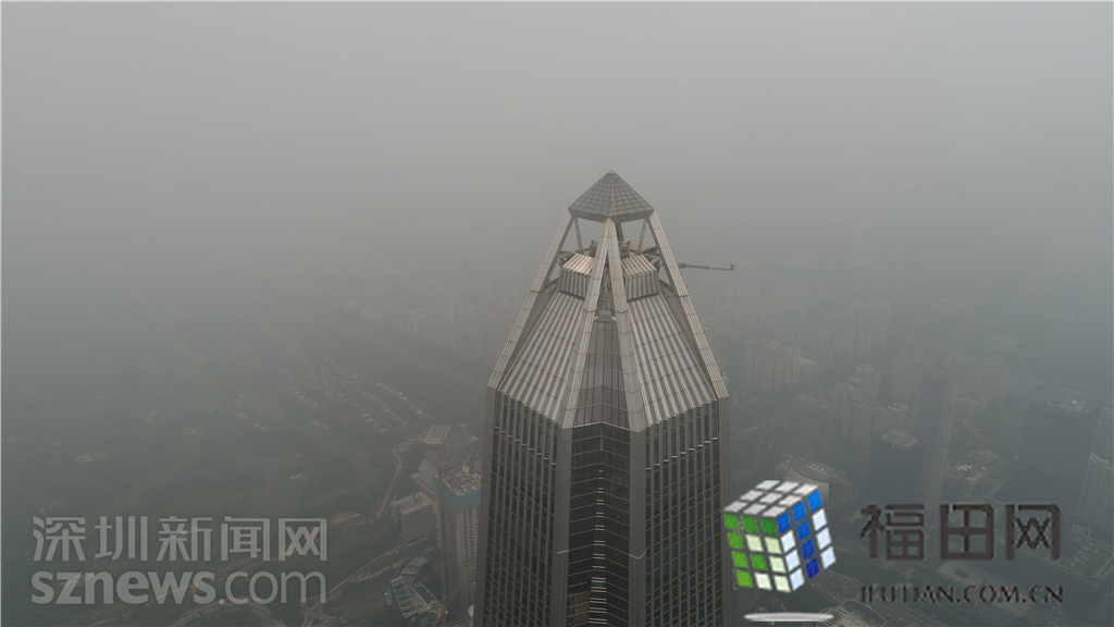 記者在福田中心區(qū)看到,大量的灰霾籠罩在城市上空,不少著名的地標性高樓大廈玩起了“隱身術”。比如,平安金融中心大廈若隱若現(xiàn),在上午11時、下午4時等灰霾最嚴重時候甚至完全看不見。記者操作無人機航拍福田中心區(qū)的灰霾情況,在海拔500米左右的高空,無人機的視線就被灰霾完全擋住。距離不足一百米的平安金融中心都看不見任何蹤影。