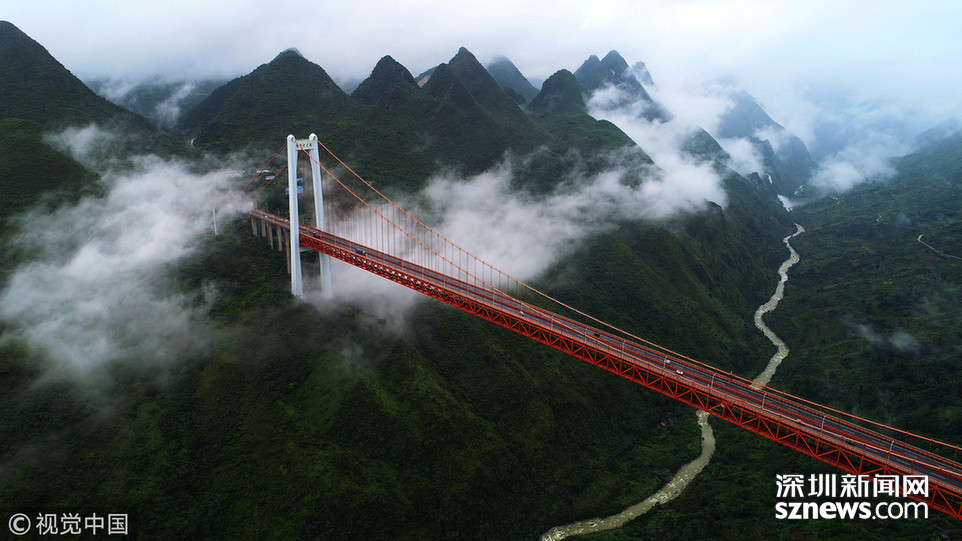 2018年6月26日,一場大雨后貴州省安順市關嶺縣壩陵河大峽谷云霧繚繞,橫跨兩岸的壩陵河大橋在云霧中時隱時現(xiàn),更顯雄偉壯觀。