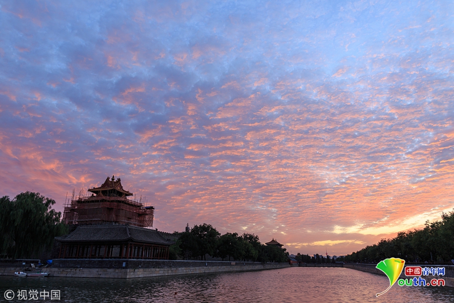 2018年9月5日,北京迎晴好天氣,傍晚時(shí)分,落日晚霞美不勝收。天空出現(xiàn)美麗的火燒云,映照故宮博物院角樓。圖片來源:視覺中國(guó)