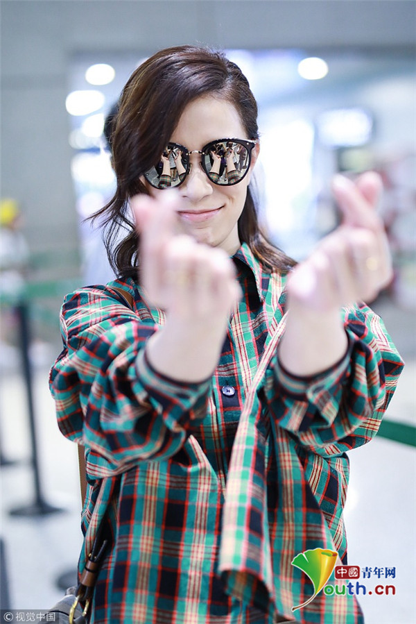 2018年9月9日,“嫻妃”佘詩曼從上海機場飛往北京機場,她擺“剪刀腿”大方任拍,身穿格紋襯搭配衫燈籠褲,時髦青春衣品超贊!