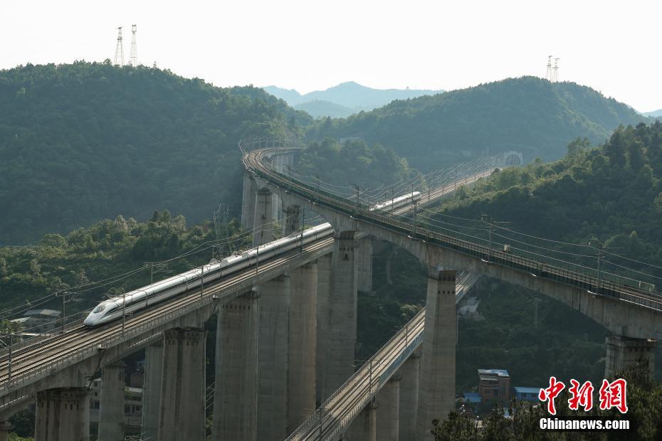 5月16日,一列動車從貴陽市郊交織的橋梁上駛過。貴州省地處中國西南腹地,高原山地居多,因此高鐵建設的橋隧占比較高。在貴陽市烏當區(qū)新添寨,高鐵滬昆線、貴廣客運專線、貴開城際客運專線的隧道和橋梁交織在一起,形成“五洞五橋”并行。中新社記者賀俊怡 攝