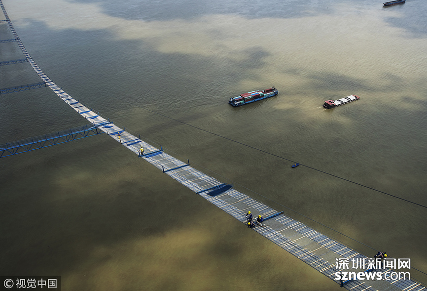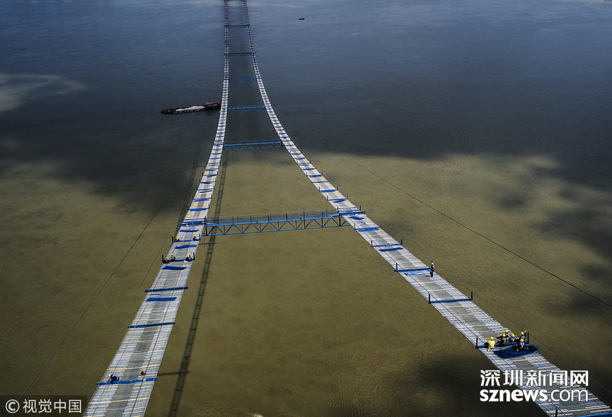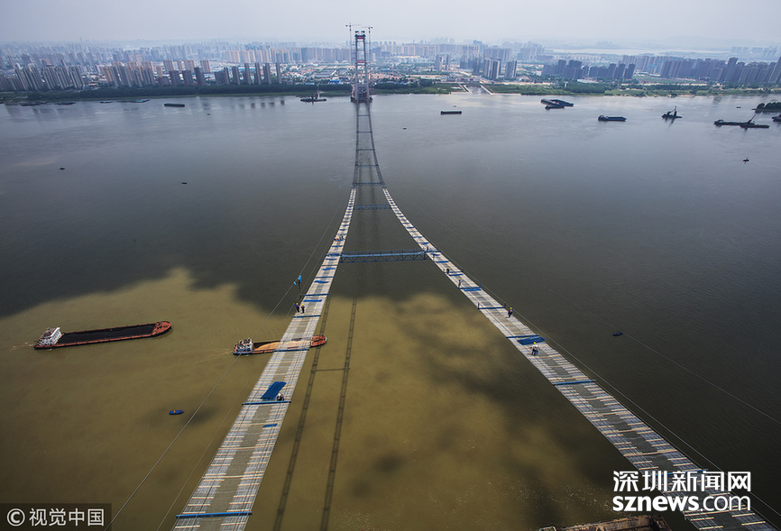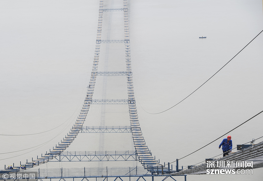 2018年5月14日,武漢,武漢楊泗港長江大橋上空,上部結(jié)構(gòu)施工進(jìn)入貓道面網(wǎng)鋪設(shè)階段,數(shù)十名中鐵大橋局工人在跨江高空拼搏趕超,江面上空的臨時“吊橋”悄然形成。數(shù)十名工人在長江上空228米處拼搏趕超,臨時“天梯”悄然形成。