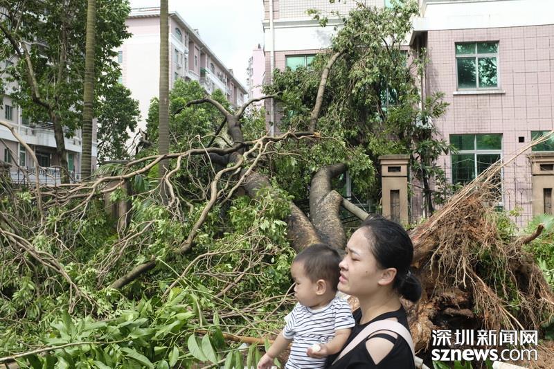 在蓮花北村靠近北環(huán)中學的小路,記者注意到拉起警戒線,有多株樹木經不住大風考驗,已投降就地倒下。