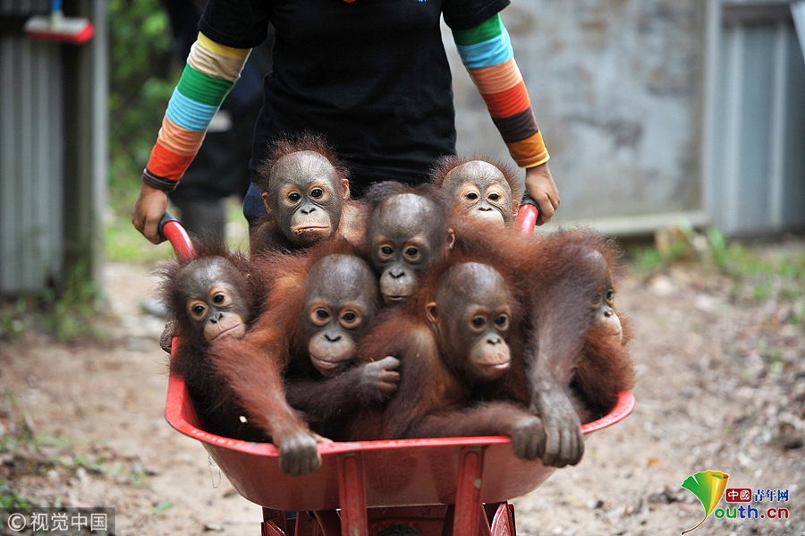 印尼動(dòng)物救援中心里 猩猩寶寶擠“校車”“上學(xué)”超萌