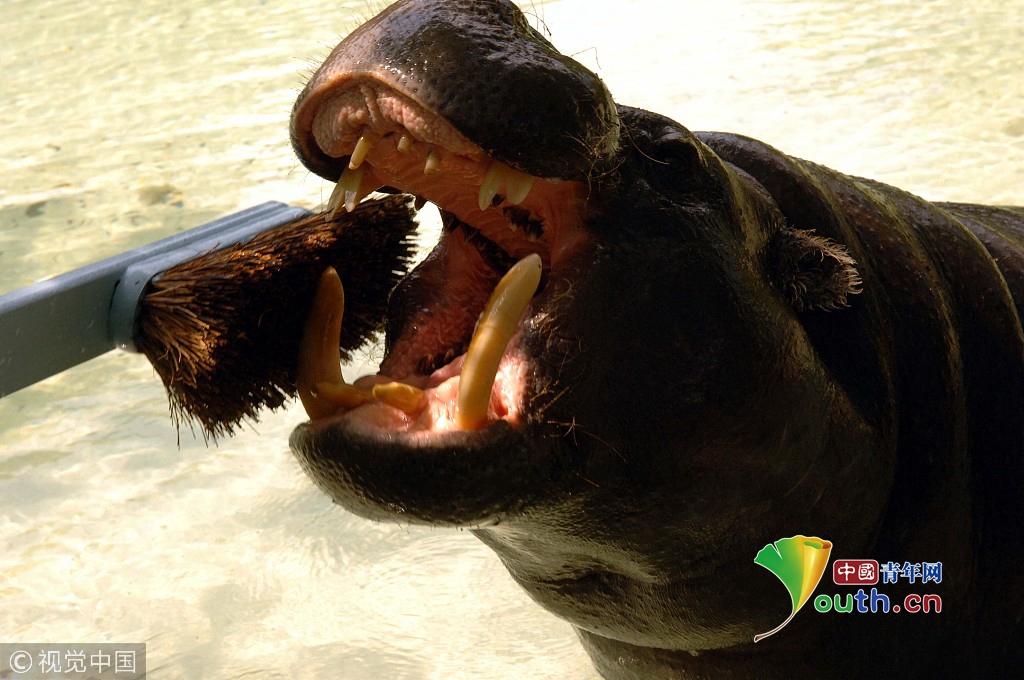 2006年7月20日,英國倫敦動(dòng)物園里,工作人員正在用一個(gè)新的5英尺長的牙刷給河馬Thug刷牙。動(dòng)物園里的兩只河馬Nicky與Thug,它們分別有一個(gè)粉色和藍(lán)色的牙刷。為了慶祝換新牙刷,倫敦動(dòng)物園將在23日“不要忘記牙刷日”實(shí)行入園半價(jià)優(yōu)惠。