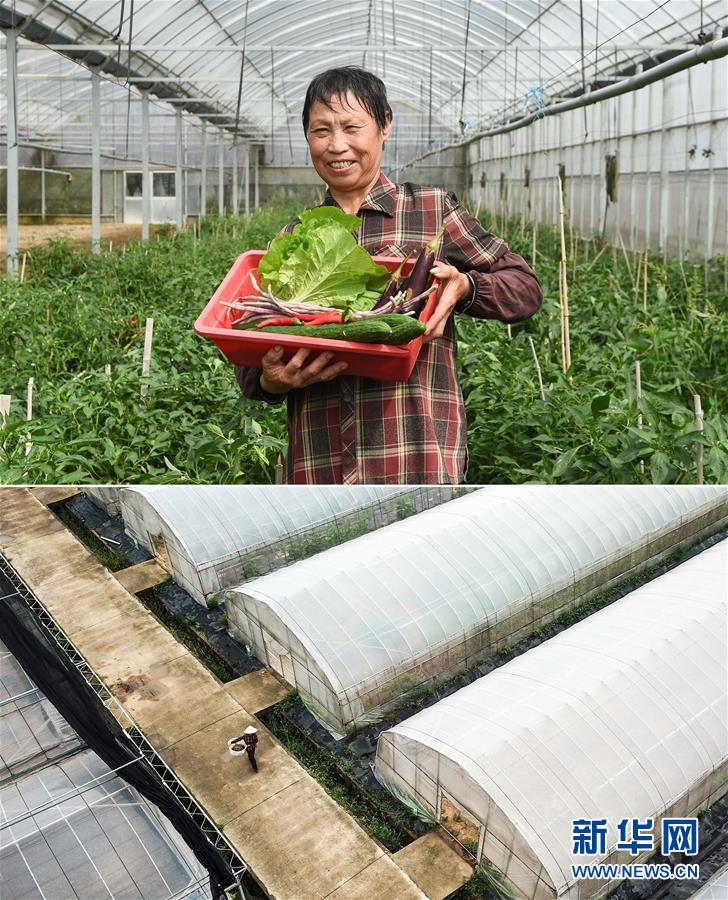 這張拼版照片顯示的是:上圖,9月20日,在江蘇省常州市鐘樓區(qū)鐘樓現(xiàn)代農(nóng)業(yè)產(chǎn)業(yè)園,菜農(nóng)邵新華展示剛采摘的蔬菜;下圖,9月20日,菜農(nóng)邵新華在農(nóng)業(yè)產(chǎn)業(yè)園的大棚旁搬運(yùn)蔬菜(無(wú)人機(jī)拍攝)。 新華社記者李博攝