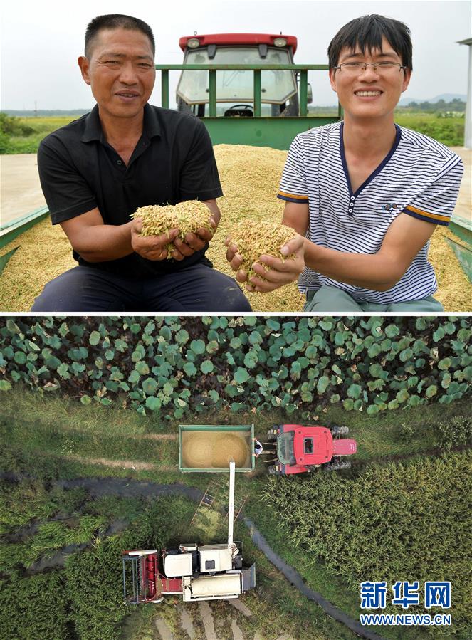 這張拼版照片顯示的是:上圖,9月21日,在江西省南昌市新建區(qū)留田村,種糧大戶周小林(左)、周標(biāo)父子展示收獲的稻谷;下圖,9月21日,周小林、周標(biāo)父子操作農(nóng)機(jī)收割中稻,同時(shí)將稻谷裝入拖拉機(jī)(無(wú)人機(jī)拍攝)。 新華社記者彭昭之?dāng)z