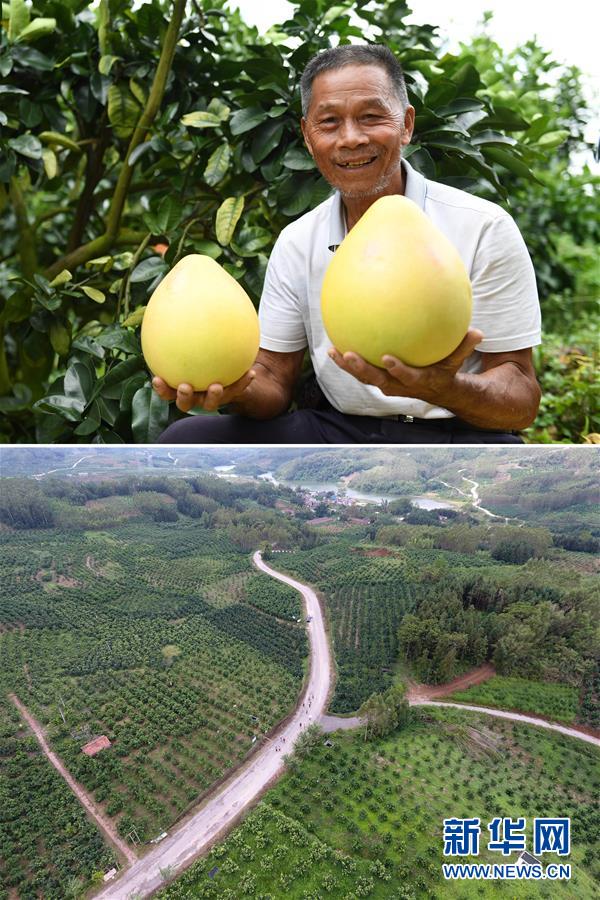 這張拼版照片顯示的是:上圖,9月18日,廣西武宣縣東鄉(xiāng)鎮(zhèn)風(fēng)沿村村民陳紹桂展示剛采摘的蜜柚;下圖,9月18日,人們?cè)陲L(fēng)沿村三紅蜜柚種植基地內(nèi)行走(無(wú)人機(jī)拍攝)。 新華社記者陸波岸攝