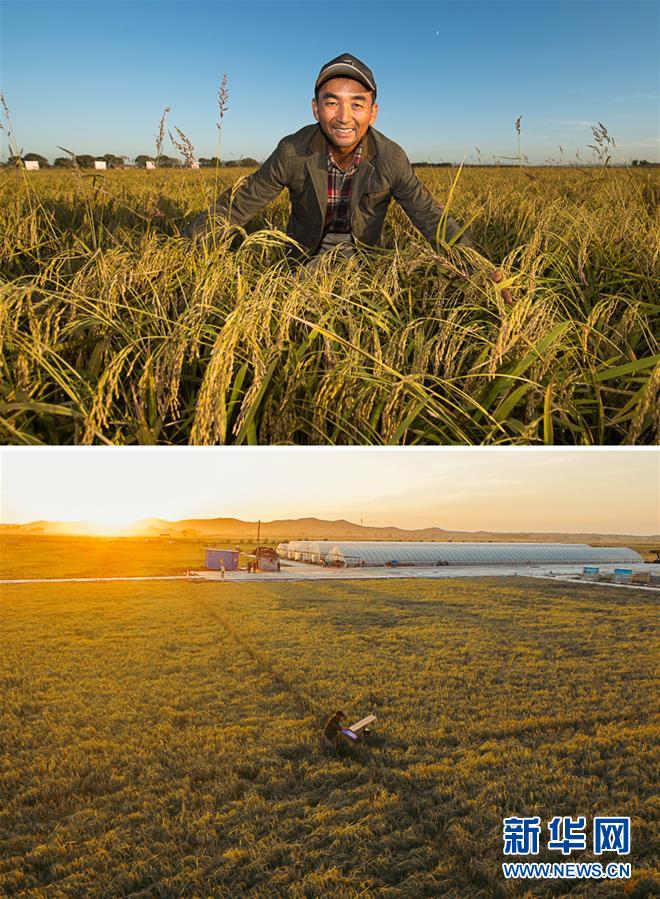 這張拼版照片顯示的是:上圖,9月18日,在吉林省舒蘭市平安鎮(zhèn)金星村,有機(jī)水稻種植戶李學(xué)明站在稻田里;下圖,9月18日,李學(xué)明在清理稻田間設(shè)置的太陽(yáng)能物理滅蟲器(無(wú)人機(jī)拍攝)。 新華社記者許暢攝