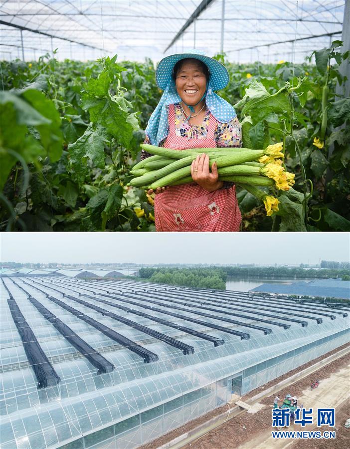 這張拼版照片顯示的是:上圖,9月21日,在江蘇省響水縣九豐現(xiàn)代高效農(nóng)業(yè)示范園的大棚內(nèi),56歲的農(nóng)民徐曉菊展示收獲的絲瓜;下圖,9月21日,徐曉菊(中)和村民一起搬運(yùn)收獲的絲瓜(無(wú)人機(jī)拍攝)。 新華社記者季春鵬攝