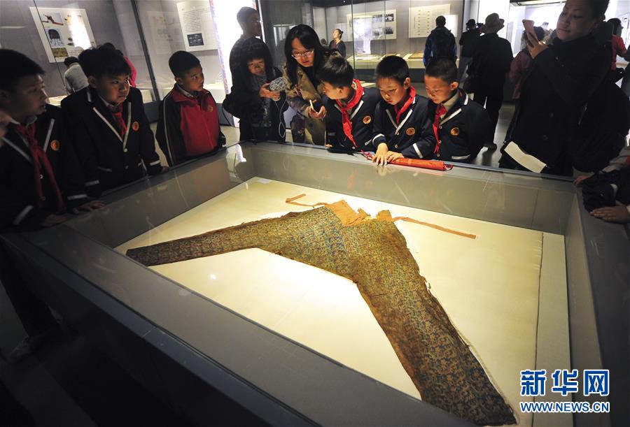 9月24日,在位于烏魯木齊的新疆博物館,參觀者在“尼雅·考古·故事——中日尼雅考古30周年成果展”上觀看“五星出東方利中國”錦護(hù)臂。此次展覽從9月22日持續(xù)到2019年1月。新華社記者 王菲 攝
