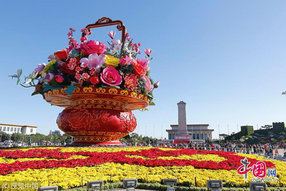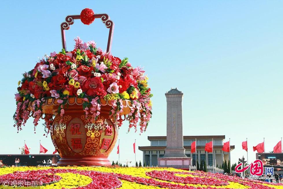 當(dāng)日,“祝福祖國(guó)”巨型花籃在北京天安門廣場(chǎng)全面亮相。據(jù)了解,從2011年開始,“祝福祖國(guó)”巨型花籃一直作為天安門廣場(chǎng)中心花壇的主景在國(guó)慶節(jié)期間向祖國(guó)獻(xiàn)禮。今年花籃內(nèi)布置有紅掌、梅花、康乃馨、向日葵、蘭花、月季等多種仿真花卉,寓意幸福吉祥。 新華社記者 李賀 攝