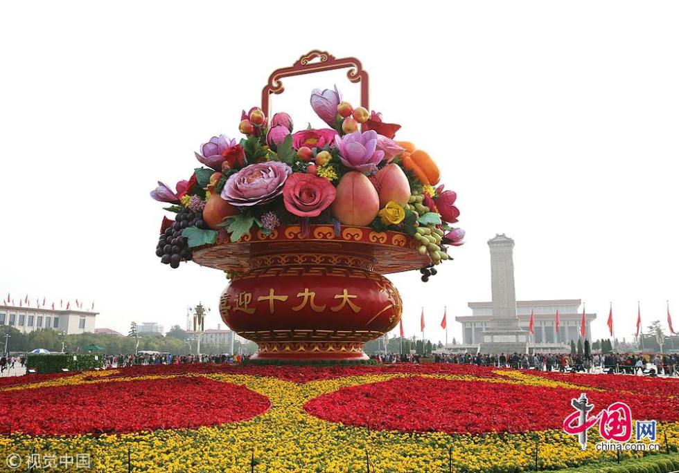 2017年天安門廣場(chǎng)大花籃以喜慶的花果籃為主景,花籃頂高17米,籃體高15.3米,底部直徑達(dá)50米。籃體南側(cè)寫有“祝福祖國(guó)、1949-2017”,北側(cè)寫有“喜迎十九大” 字樣。花果籃內(nèi)共使用主花56朵(牡丹、月季、玉蘭、金桂、迎春花、蘋果花、紫藤花、文心蘭、葉子花),其中最大牡丹直徑3.2米,果實(shí)6種(石榴、桃、柿子、蘋果、海棠、葡萄)。寓意吉祥的果實(shí)和花卉,象征十八大以來,黨和國(guó)家在各個(gè)領(lǐng)域取得的輝煌成就,碩果累累。底部花壇采用心形圖案,寓意紅心向黨,象征著全國(guó)人民緊密團(tuán)結(jié)在以習(xí)近平同志為核心的黨中央周圍,表達(dá)對(duì)祖國(guó)繁榮富強(qiáng)、欣欣向榮的美好祝福。