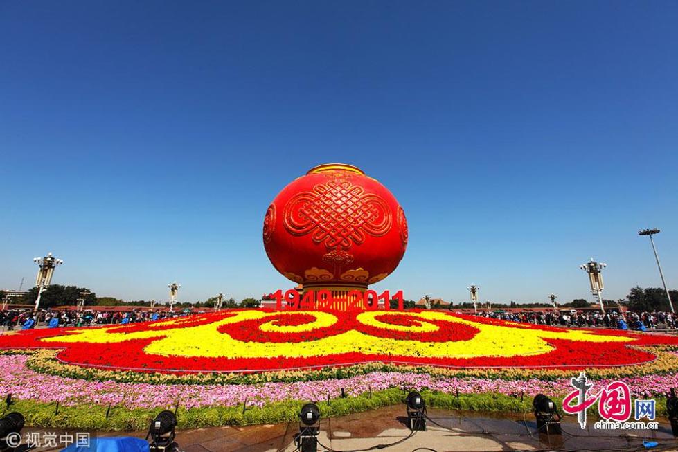 2011年10月04日,在北京蔚藍的天空下,“祝福祖國”的大型花壇屹立在天安門廣場中央。蘇陽攝影